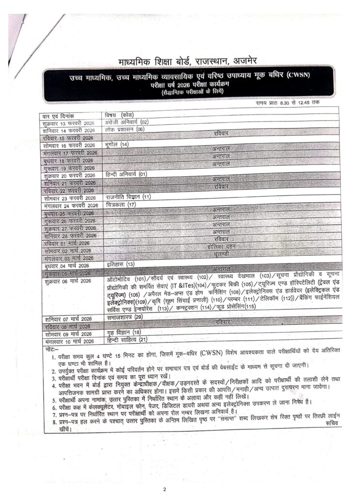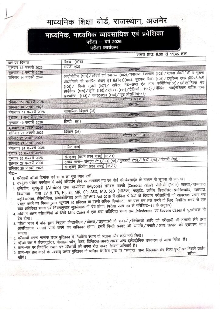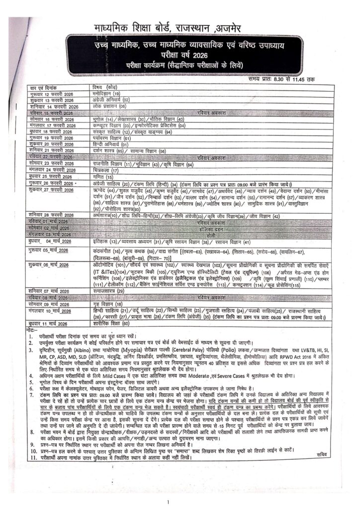 राजस्थान माध्यमिक शिक्षा बोर्ड 10वीं और 12वीं की परीक्षाओं का टाइम टेबल जारीBy Rbse News Team / December 19, 2025